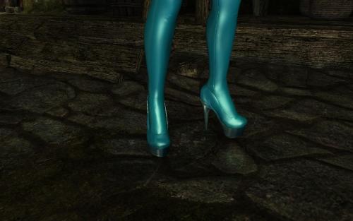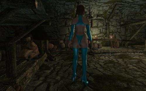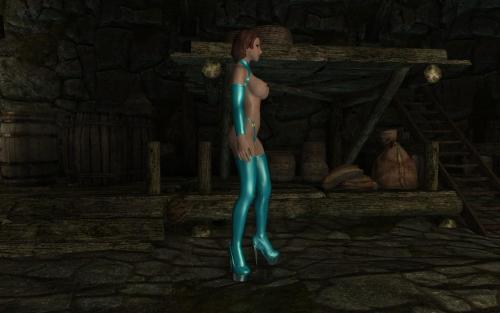 Just a simple blue latex bolero with arm sleeves, underwear and heels.